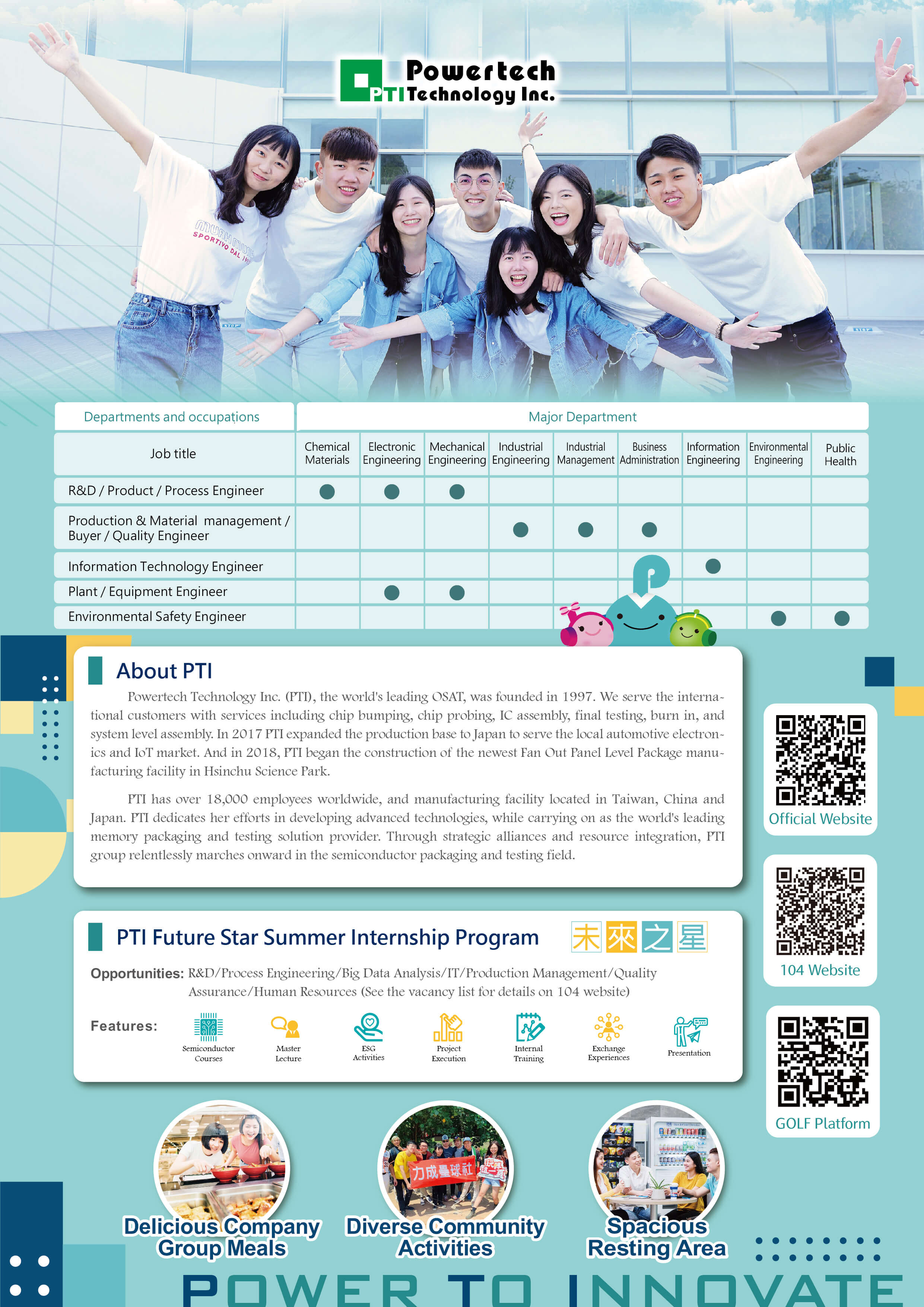 Powertech Technology Inc. (PTI), the world's leading OSAT, was founded in 1997. We serve the international customers with services including chip bumping, chip probing, IC assembly, final testing, burn in, and system level assembly. In 2018, PTI began the construction of the newest Fan Out Panel Level Package manufacturing facility in Hsinchu Science Park.